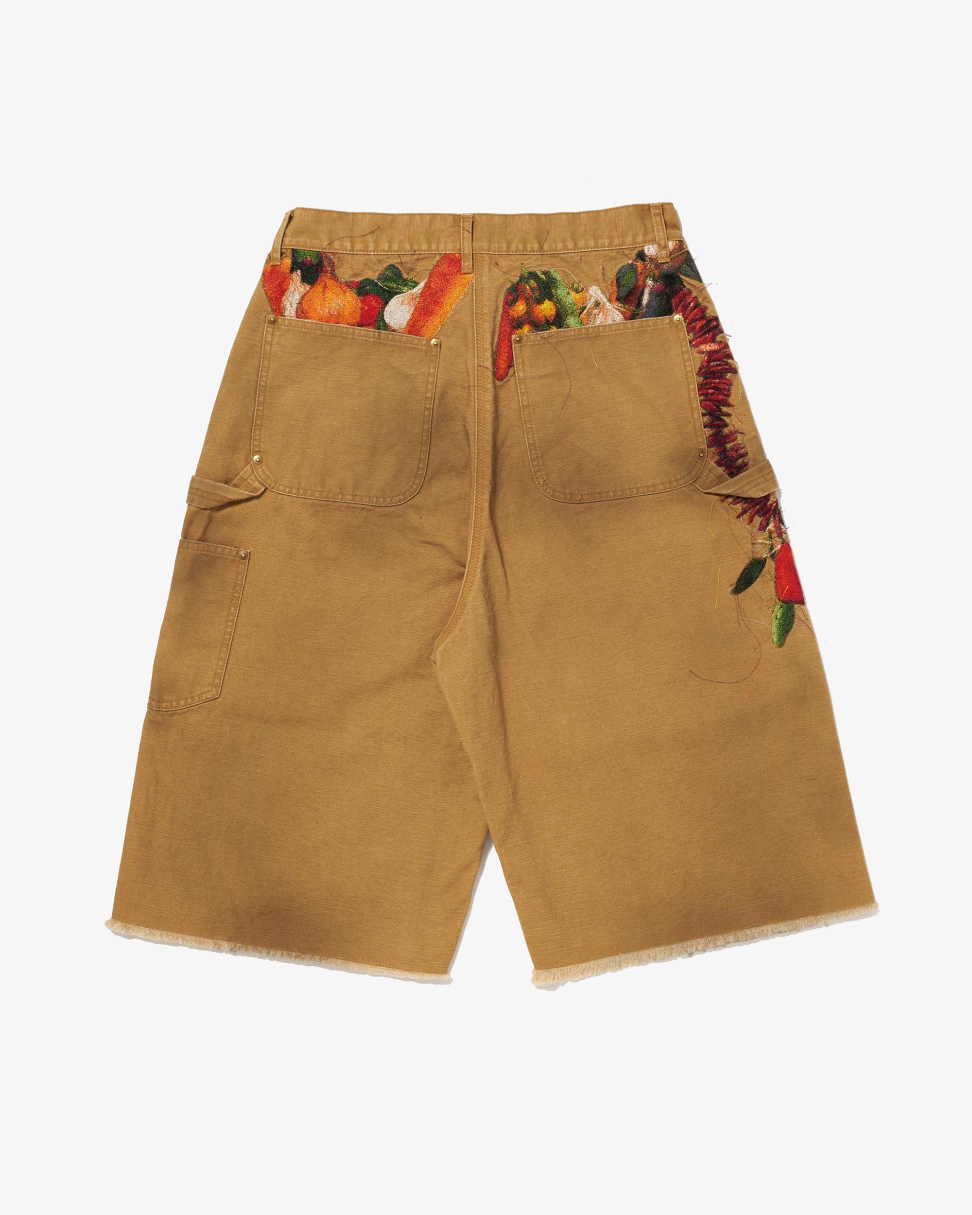 CUTOFF PANTS MADE FROM GARMENT-DYED DUCK FABRIC, FEATURING EMBROIDERED VEGETABLES—ONIONS, CARROTS, BELL PEPPERS, GARLIC, RED CHILI PEPPERS, AND EGGPLANTS—SPILLING FROM THE POCKETS AND DANGLING FROM THE BELT LOOPS. THEY LOOK AS IF A BASKET OF HARVEST WAS STRAPPED TO YOUR WAIST.