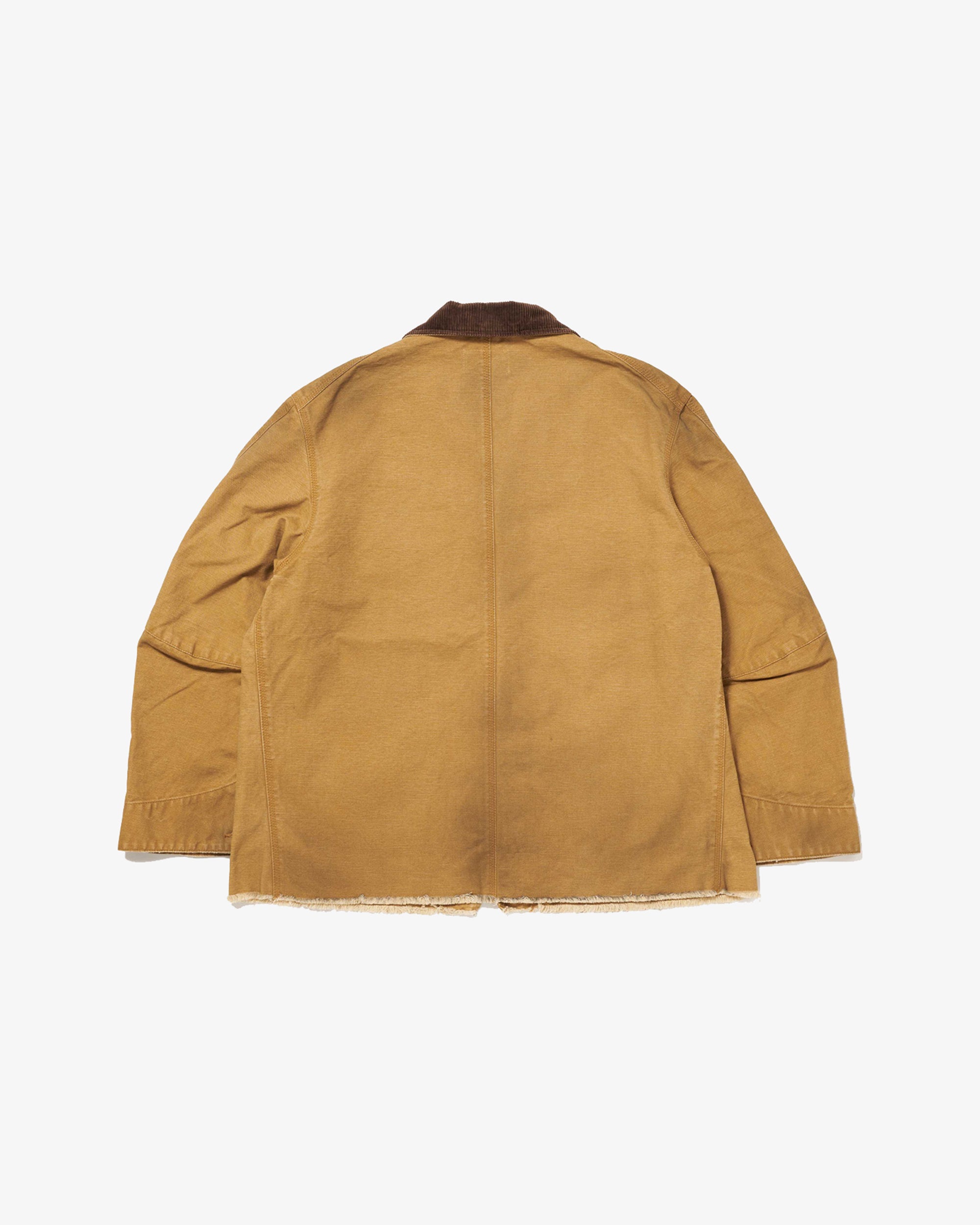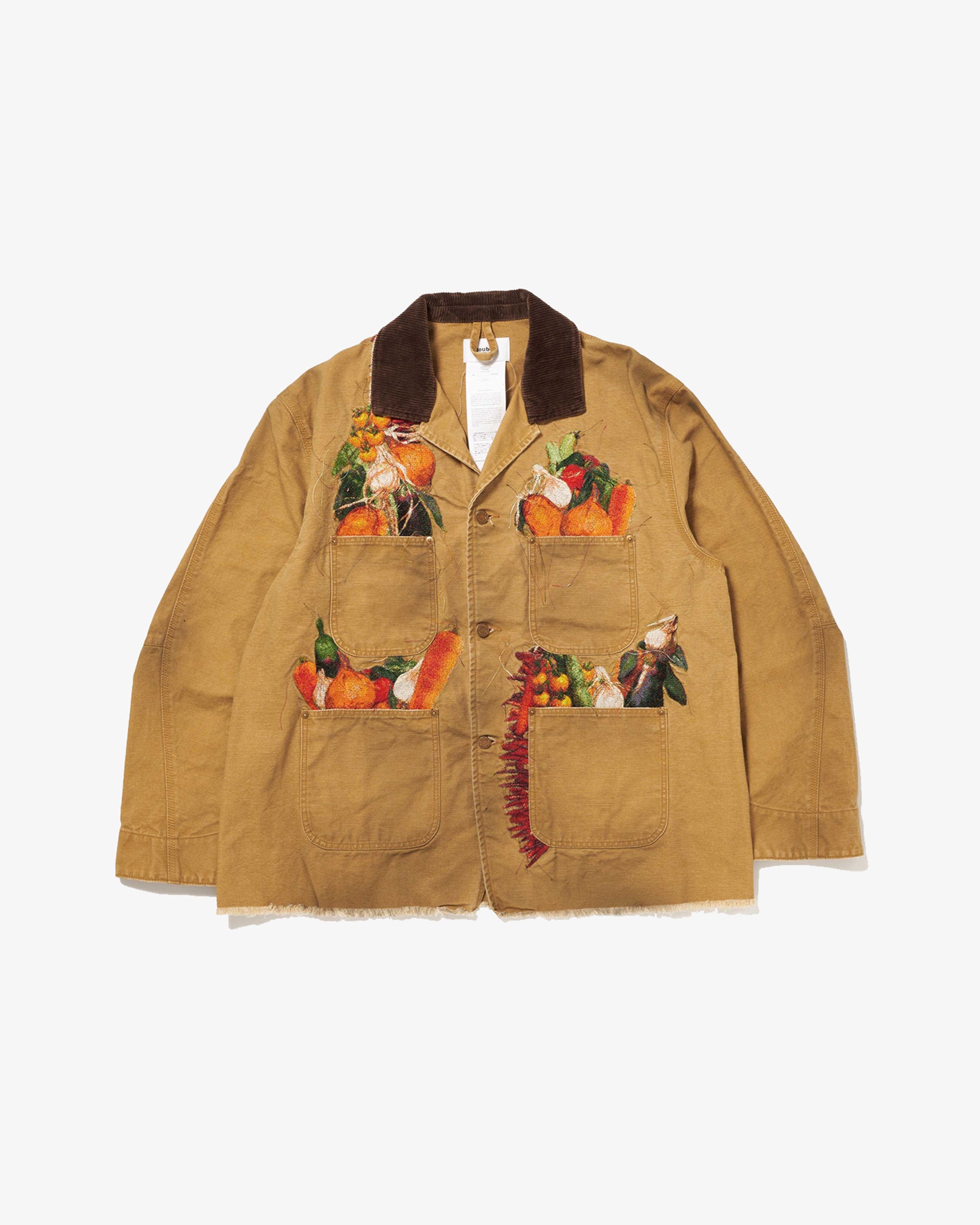 A WORK JACKET MADE FROM GARMENT-DYED AND WASHED DUCK FABRIC, FEATURING REALISTIC EMBROIDERY OF ONIONS, CARROTS, BELL PEPPERS, GARLIC, RED CHILI PEPPERS, AND EGGPLANTS. THE RUGGED SILHOUETTE RESEMBLES VINTAGE UTILITY WEAR, CONTRASTED BY THE COLORFUL VEGETABLES OVERFLOWING FROM THE POCKETS.