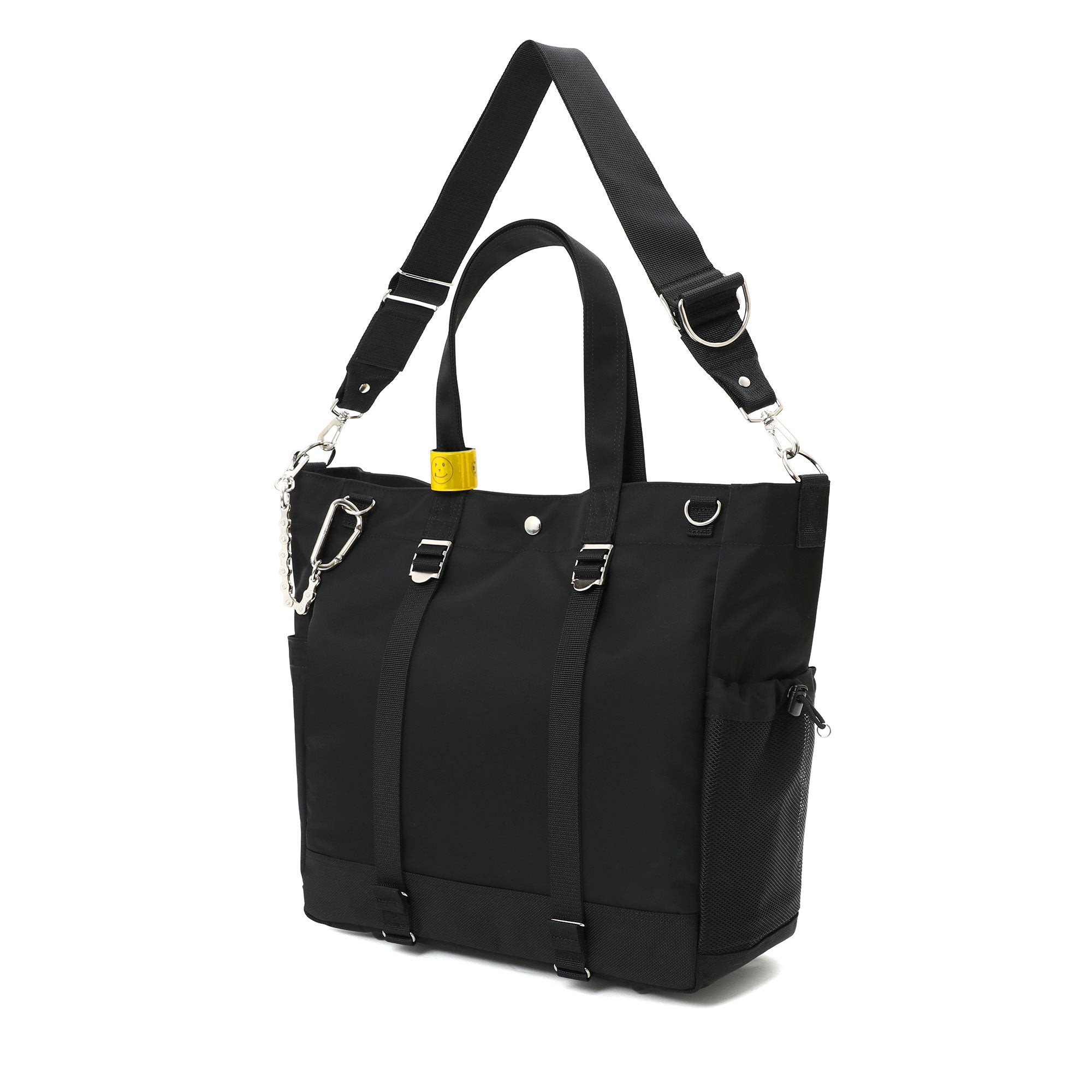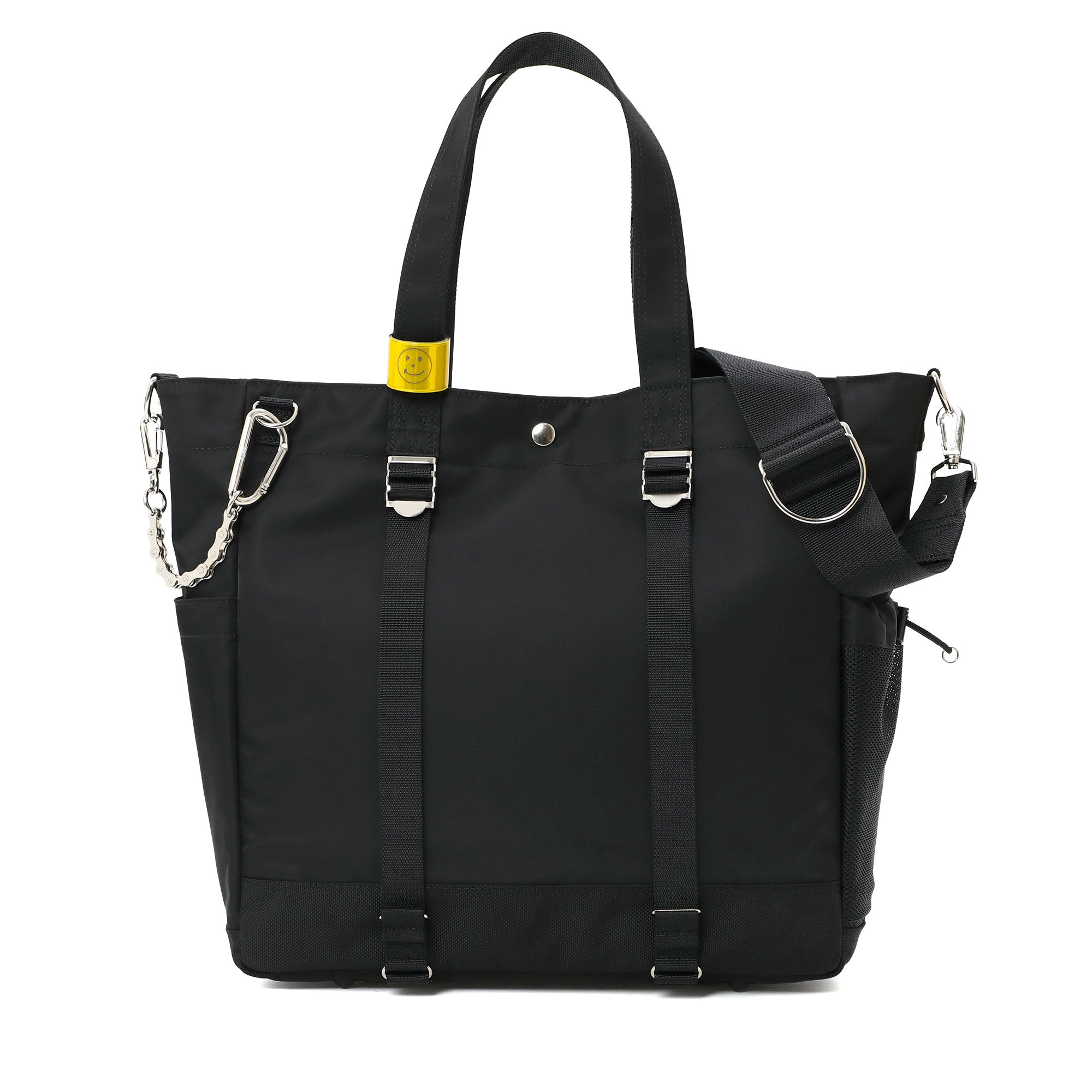 メイン素材にナイロンツイル生地を使用しており、PVC加工を施すことで耐水性を高めています。負荷のかかりやすい底マチ部分にはコーデュラバリスティックナイロンを採用し、耐久性も上げました。本体の前面や底面に身の回りのものを簡易的に固定して持ち運ぶことができるスリングバインダーも配しています。