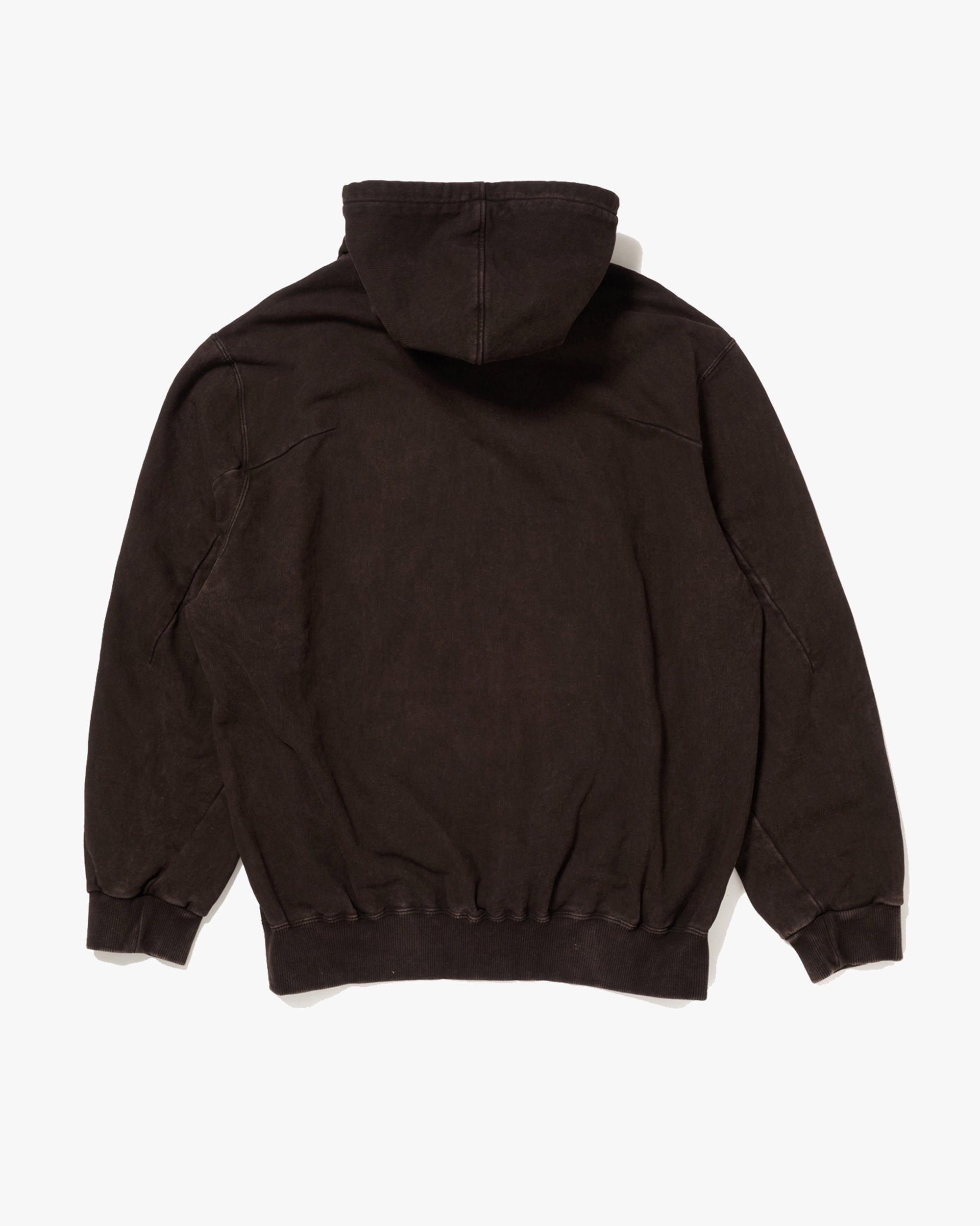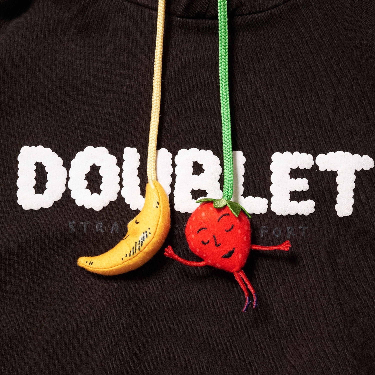 A HOODIE HAND-DYED USING THE TRADITIONAL MUD-DYEING METHOD OF AMAMI OSHIMA. THE DRAWSTRINGS ARE FINISHED WITH HANDCRAFTED STRAWBERRY AND MOON CHARMS—ICONS OF SHFU. A FOAM PRINT LOGO RISES ON THE FRONT LIKE A CLOUD. THIS PIECE COULD ONLY HAVE BEEN CREATED THROUGH OUR COLLABORATION WITH SHFU, EXPRESSING NATURE’S BOUNTY AND A SENSE OF PLAYFULNESS.